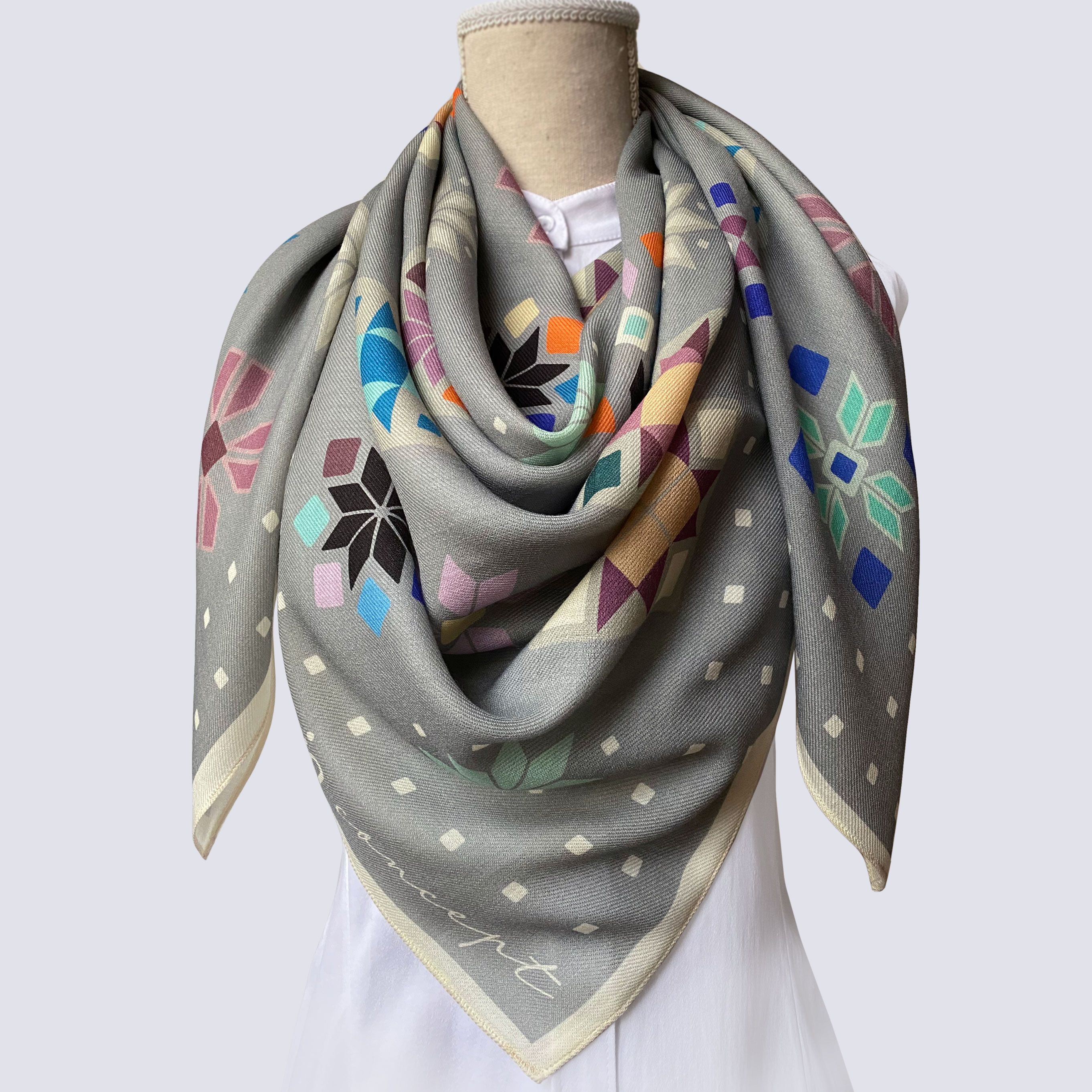 Eșarfa de lână și matase POVESTEA FULGILOR DE NEA 120 cm poartă cu ea discreția, dar și strălucirea fulgilor de nea.