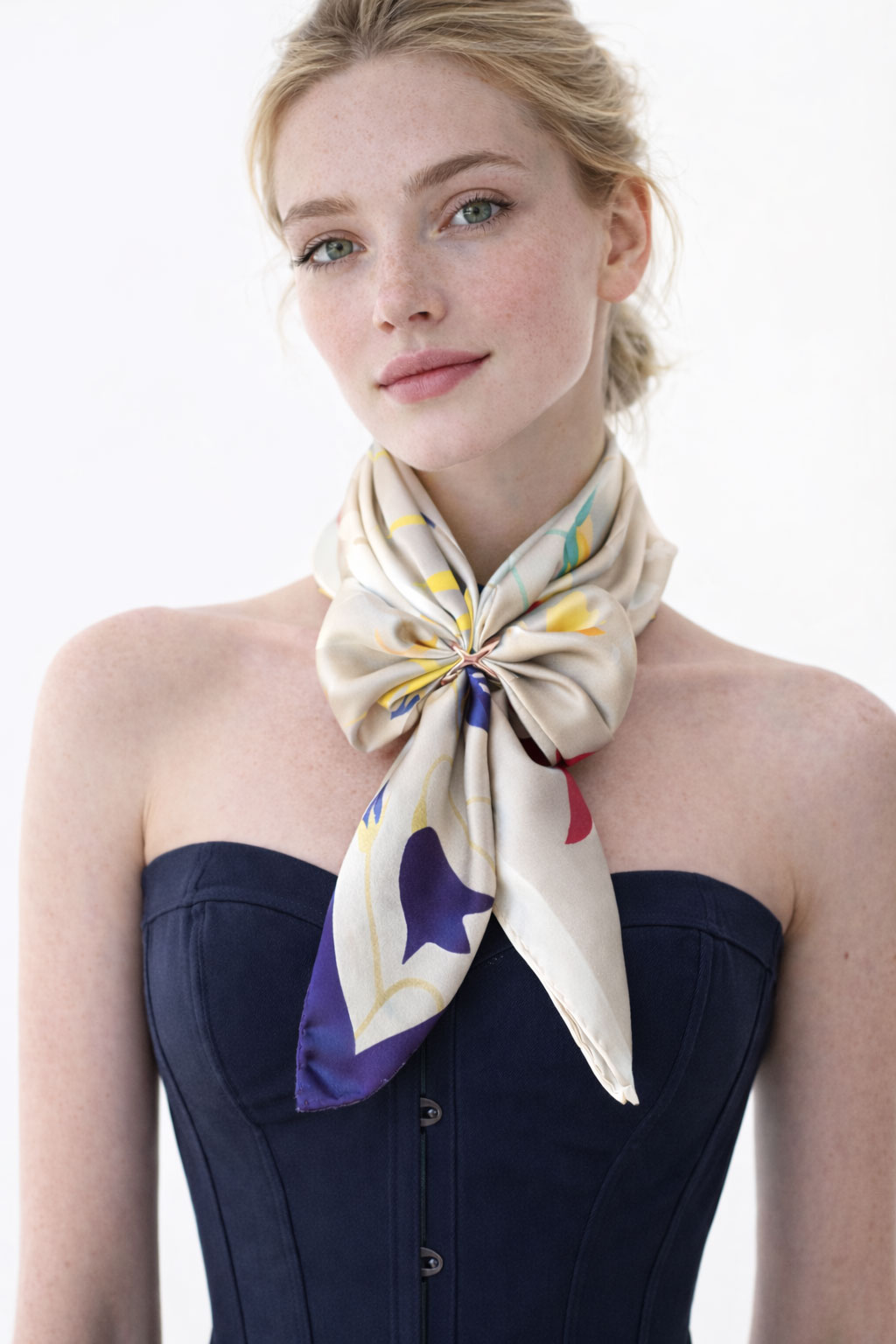 Eșarfa twilly este, de fapt, o panglică, din două straturi de mătase twill, tăiate diagonal la capete și cusute între ele. Stă mai aproape de ideea de linie decât de cea de volum, nu își propune să aibă fluiditatea unei eșarfe clasice. Nu acoperă, nu încălzește. Mai degrabă marchează. Pune un accent acolo unde alegi tu: la gât, în păr, pe talie sau chiar pe un obiect. Iată câteva idei de purtare și câteva tehnici de legare.