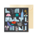 Această felicitare intitulată "La Mulți Ani" este o compoziție veselă și plină de viață, cu un design modern și jucăuș. Fundalul este de culoare gri închis, ceea ce face ca elementele colorate să iasă în evidență.Literele care formează mesajul "La Mulți Ani" sunt stilizate geometric, în nuanțe de bleu deschis, și sunt integrate armonios printre diverse simboluri sugestive. Printre ele se regăsesc un trifoi cu patru foi, o floare roșie de mac, o pasăre în zbor, o sticlă de vin și un pahar, un ochi simbolic, căni cu inimioare, un ceainic, un diamant, zaruri, o pisică violet jucăușă, candele aprinse și buburuze.