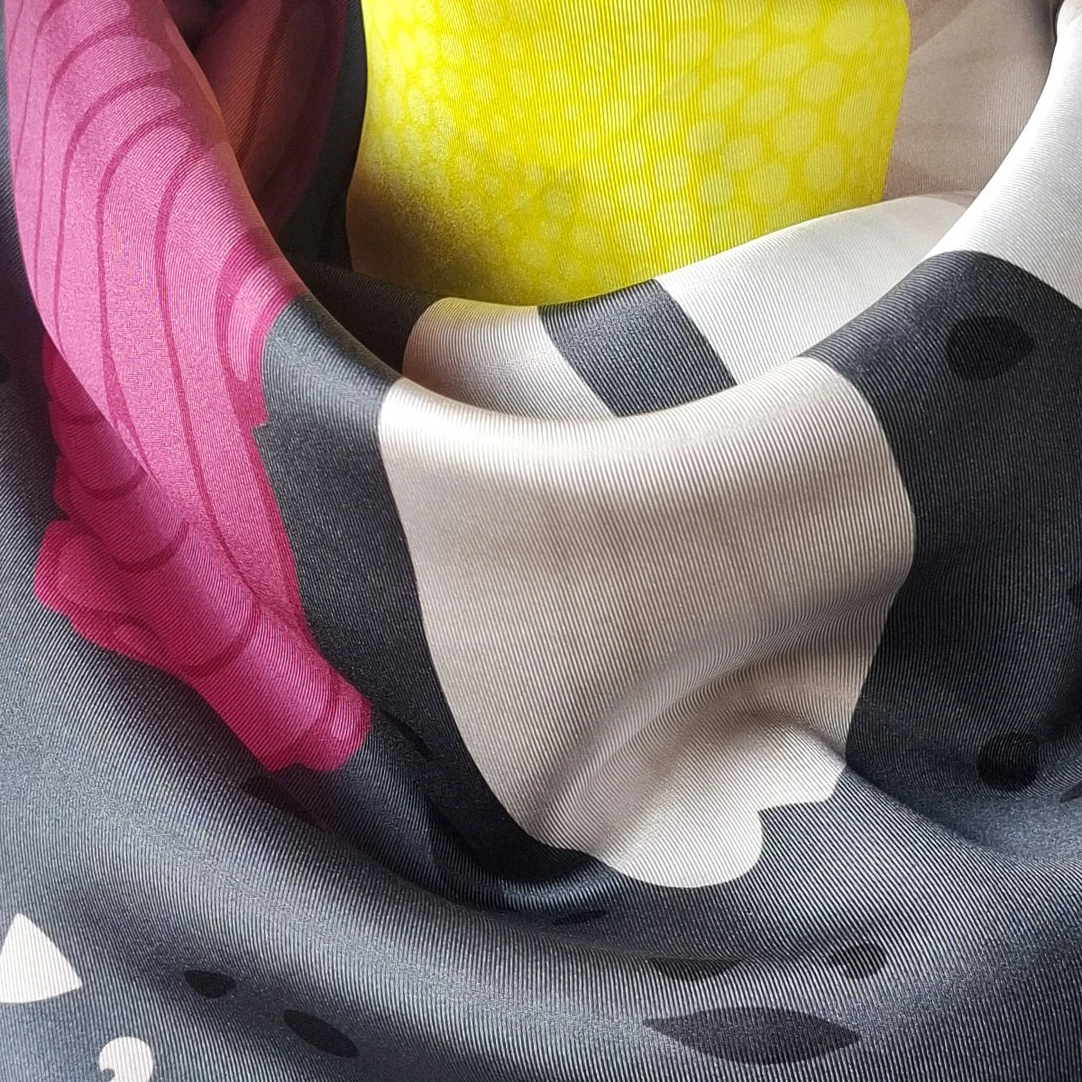 Eșarfă din mătase naturală twill 100%, printată digital față verso, după un design original de Anca Cernea.
