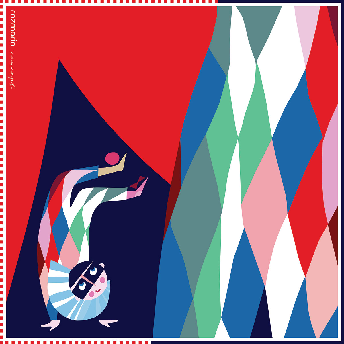 El este aici mai mult decât un personaj– este un curcubeu acrobat, o poezie vie a echilibrului și a jocului. Lumea spectacolului pare că se naște din pașii lui inversați, din zâmbetul pictat, din energia fragmentelor multicolore care se contopesc într-un ritm vizual aparte.